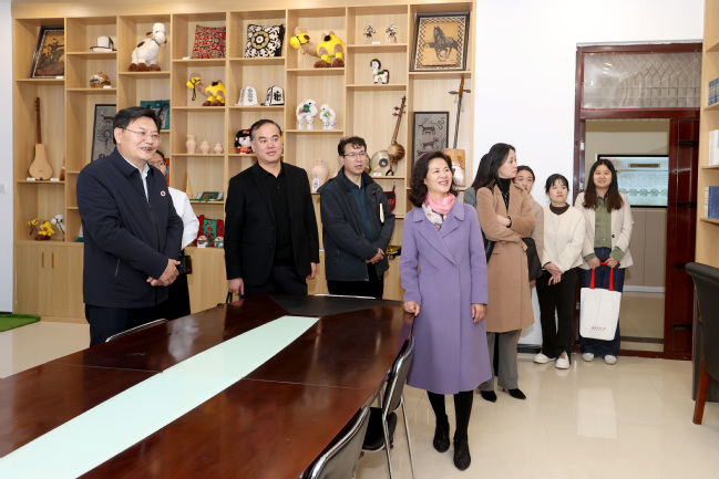 座谈会前,林素兰一行在我校教育科学学院实验中心教育技术实验室、黄文弼中心、铸牢中华民族共同体意识教育实践基地(美育浸润基地)进行了参观调研。